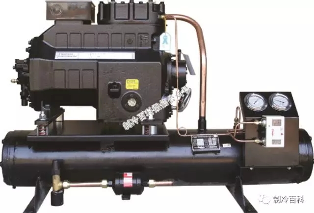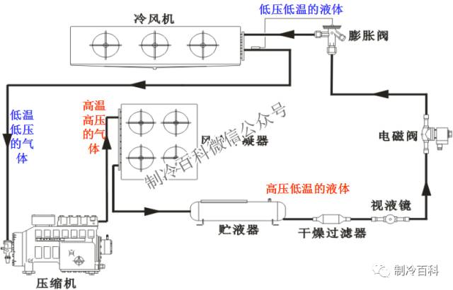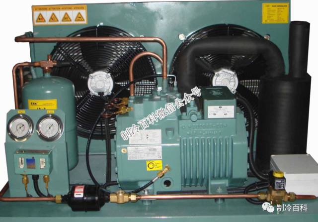 2、通过风冷冷凝器(或水冷冷凝器)被空气(或水)带走制冷剂在蒸发器内吸收的热量,冷却冷凝为常温高压的过冷液体;